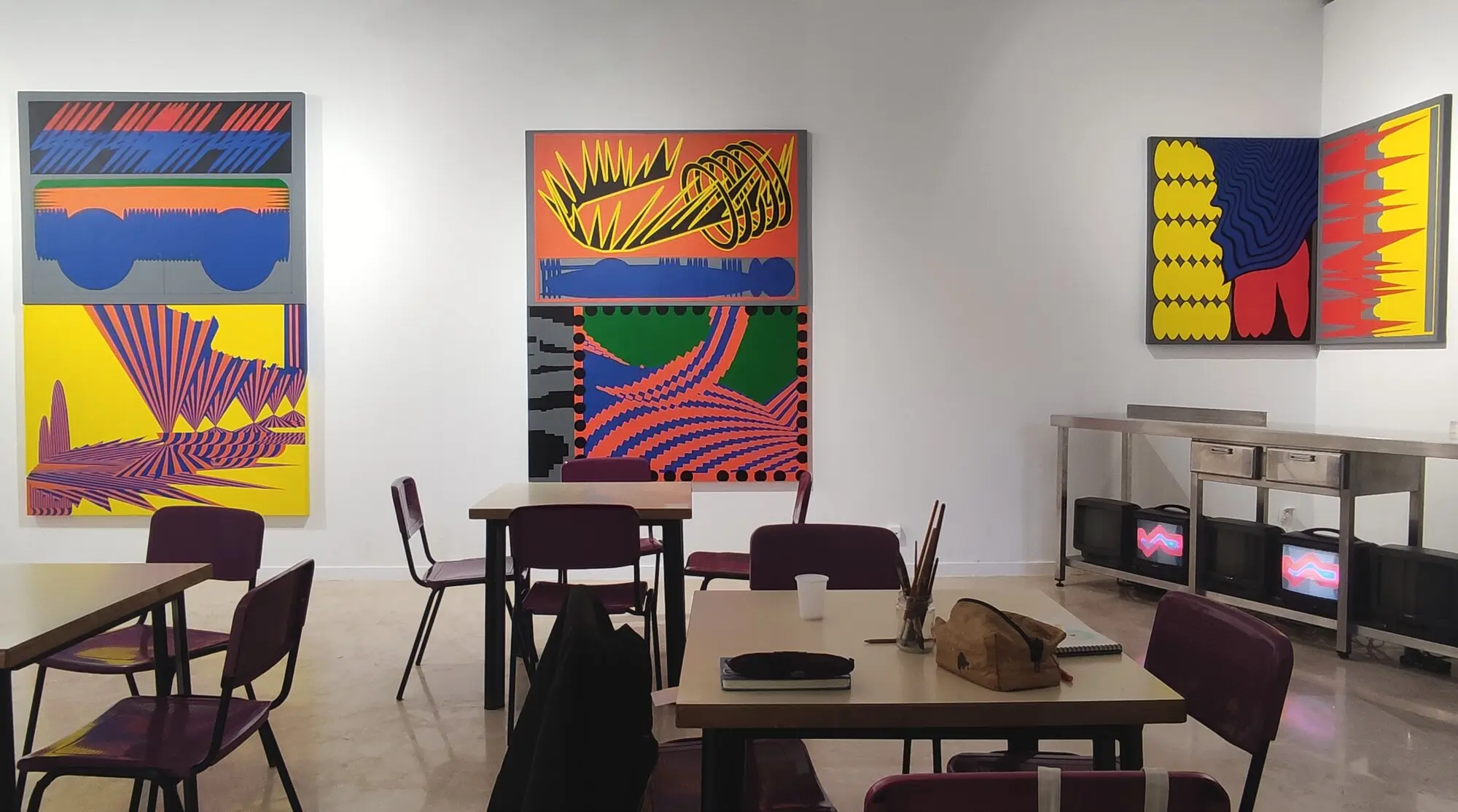 La propia concepción de este proyecto ha tenido mucho de procesual. Lo que empezó como una invitación al uso para mostrar la obra de artistas cuyas lógicas formales y conceptuales convergen en diferentes puntos, acabó convertido en un extenso debate sobre la posibilidad de realizar un proyecto a cuatro manos hasta, finalmente, fructificar en esta propuesta experimental. Largas conversaciones de WhatsApp, reticencias e insistencias, lluvias de ideas tan descabelladas como soberbias. Durante un tiempo compitieron los impulsos por recrear una cafetería con las complejidades y contradicciones asociadas: ¿qué relación puede tener con las obras?, ¿cómo se ve reivindicar una cafetería por parte de quien sí la disfrutó?, ¿tenemos medios para ofrecer un servicio funcional?, ¿conseguiremos dinamizar el espacio o este mismo proyecto vivirá su fracaso?