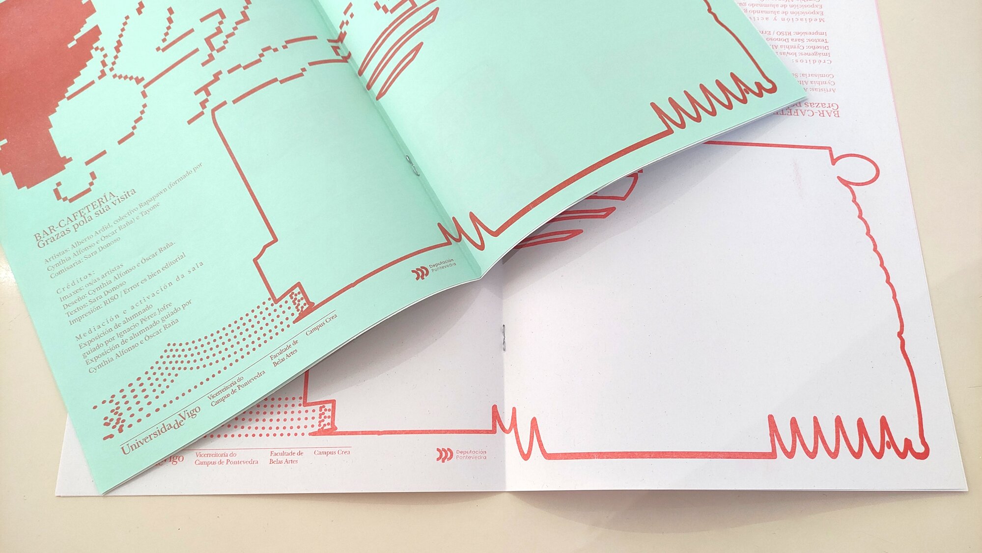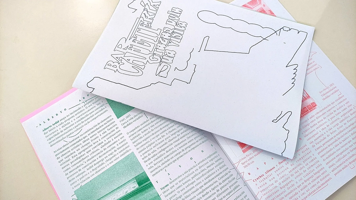 Son cuestiones que se nos escapan, y que estuvieron a punto de vencer a las ganas de recuperar un ambiente de evasión para la facultad. Pero, como exalumnos y exalumnas, quienes participamos en este proyecto continuamos relacionándonos con la universidad de muy diversas maneras: algunas veces como artistas, o colaborando en propuestas de gestión, en ocasiones también como docentes y, siempre, como allegados. No hemos dejado de medir el pulso a la actividad de Bellas Artes. Tal vez por eso surgió, a modo de broma, la posibilidad de titular “Cafetería” a esta exposición. Y la broma se fue haciendo más grande, y se valoró la opción de recrearla. Entonces, entre los variados argumentos a favor, el chat se llenó de frases como “La facultad de Belas Artes, sin su zona común de distensión, se parece más a cubículos académicos donde no se debate sobre el futuro. La cafetería es un pretexto para reivindicar esto, devolver a los espacios interacciones y debates”. Así que decidimos intentarlo.