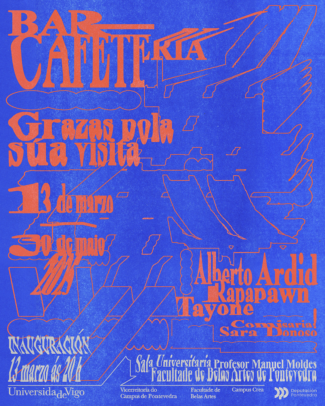 Fue en 1993 cuando Laxeiro, en solidaridad con las protestas a la precaria situación en la que se encontraba la sede provisional de la facultad, ubicada en el antiguo Hogar Provincial de Pontevedra, pintó in situ Un berro por Belas Artes. El lienzo fue donado al alumnado y su acto, casi performático, se convirtió en un grito por el futuro de la facultad. Un grito que durante décadas acompañó el tránsito de todas las personas que debatían, comían, se emborrachaban o se reunían en la cafetería. Esto no es una cafetería, pero sí es, tal vez, un nuevo grito; una voz que clama por recuperar ese punto de encuentro, por la posibilidad de volver a contar con un espacio social más allá de las aulas.